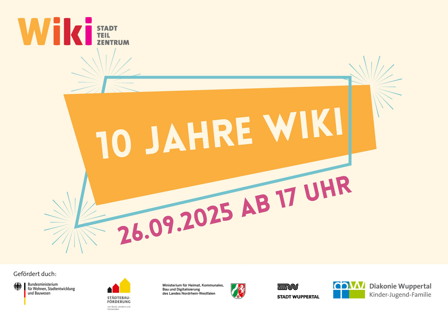 Das Stadtteilzentrum Wiki (Westkotterstraße 198, alte Wichlinghauser Kirche) feiert am Freitag, 26. September, ab 17 Uhr sein 10-jähriges Bestehen. Die Besucher erwartet ein buntes Programm mit Musik (u. a. Akkordeon, Hausmusik-Band), Spiel- und Mitmachaktionen, einer Kleidertauschbörse, Leckereien vom Grill, Fingerfood, Kaffee & Kuchen. Das Rahmenprogramm gibt es bis ca. 20 Uhr, anschließend Disco bis 22 Uhr. Mit dabei sind zahlreiche Vereine, Initiativen und Institutionen aus Wichlinghausen und Oberbarmen.